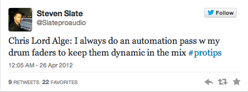 It turns out that Steven Slate has been posting mixing tips on his Twitter account for a while. The fine folks at TheProAudioFiles went ahead and collected the best of the best and got them all together in one post. Just about every tip is a tiny nugget of pure Yukon Gold. I could blabber on and on about each one, but I think Steven summed them all up pretty damn well in 140 characters or less. In the spirit of not fixing something that already works, I posted a few of my favorites below, but make sure you go check out the extremely useful article in its entirety!