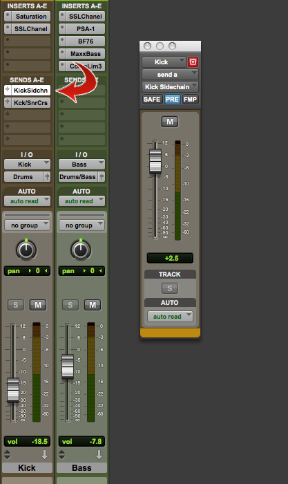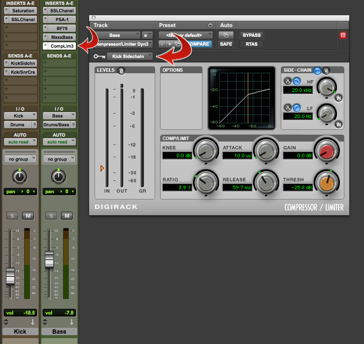 Place the compressor on your bass and set the key input to the same bus you just set up coming from your kick.