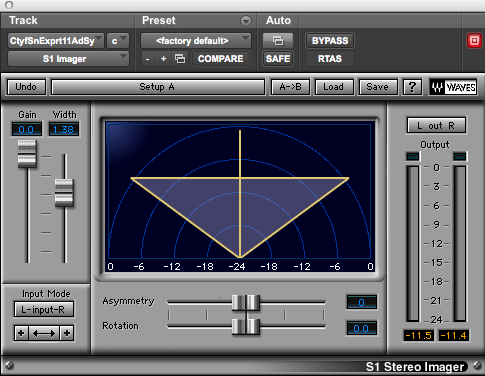 So what’s going on in here? My thought was to take this track and make it as wide as possible so that it could spread the choruses out and also to leave the center channel for the vocals. Here’s the before/after: